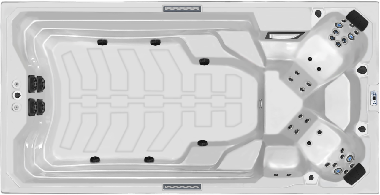 • Двойная гидросистема: 31 массажная форсунка и 2 мощных насоса противотока (2,2 кВт) обеспечивают одновременно нежный массаж и профессиональные условия для плавания